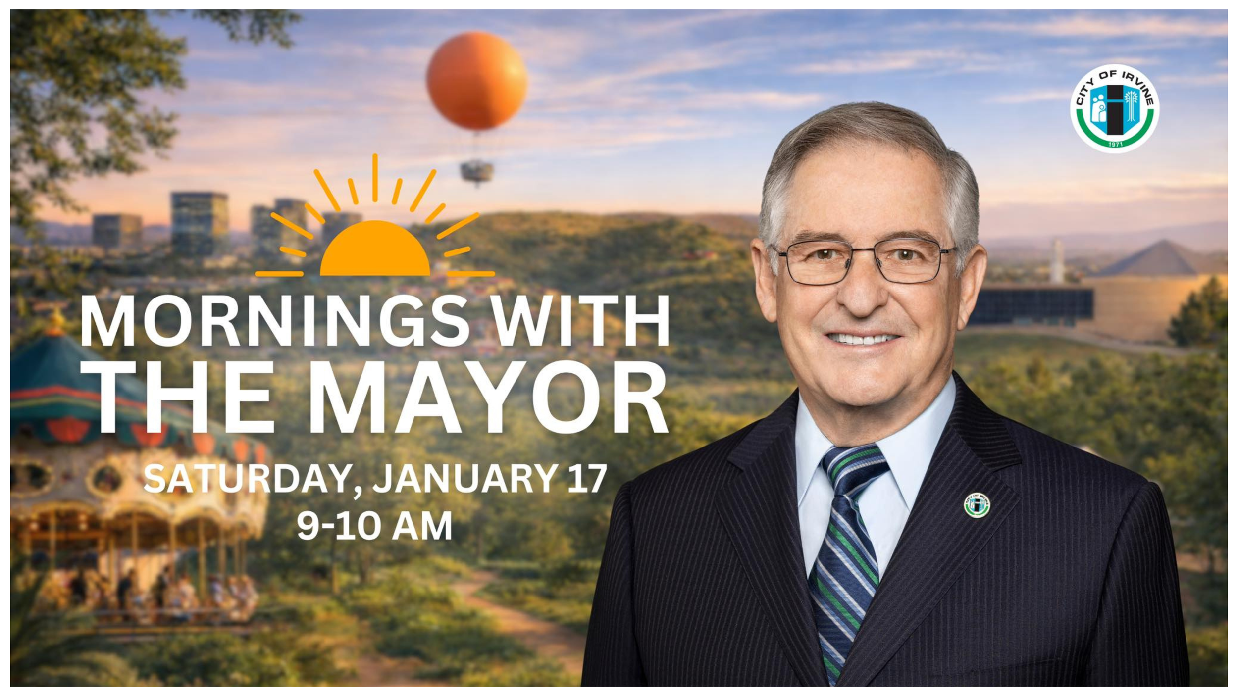 I am happy to share that Mornings with the Mayor returns this Saturday, January 17! Join me at the Irvine Civic Center (1 Civic Center Plaza) from 9 to 10 a.m. to share your questions, concerns, and ideas for our City.