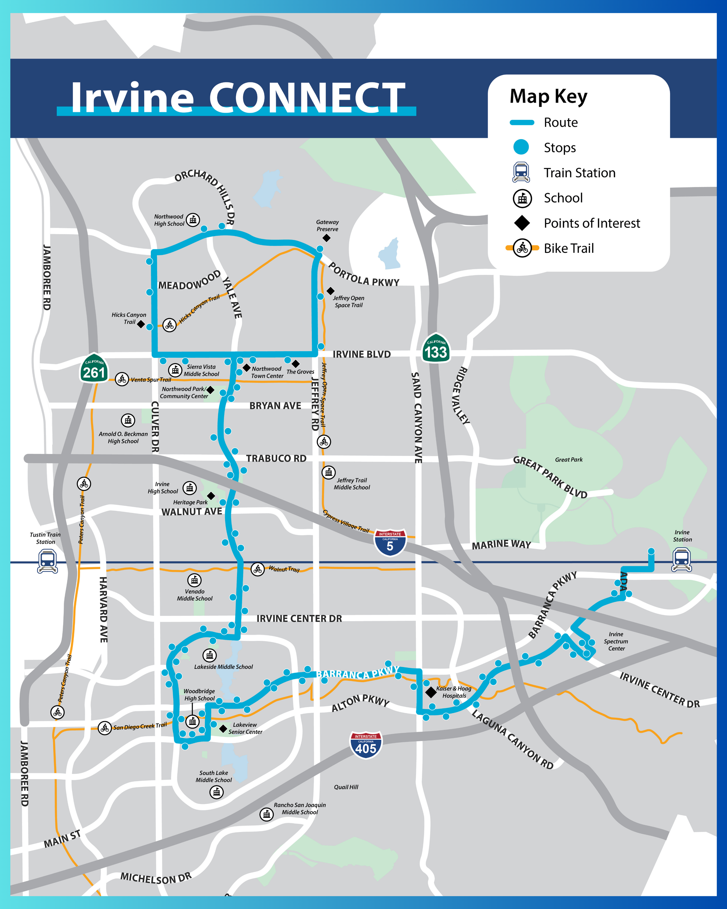 As of July 1, Irvine CONNECT’s free shuttle service has expanded! Whether you’re heading to school, work, or the park, this upgraded route links even more neighborhoods to key Irvine destinations — including Irvine Station. I encourage you to take advantage of this program.